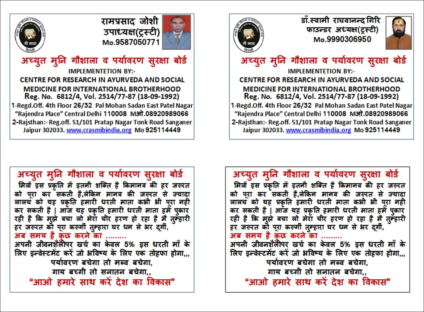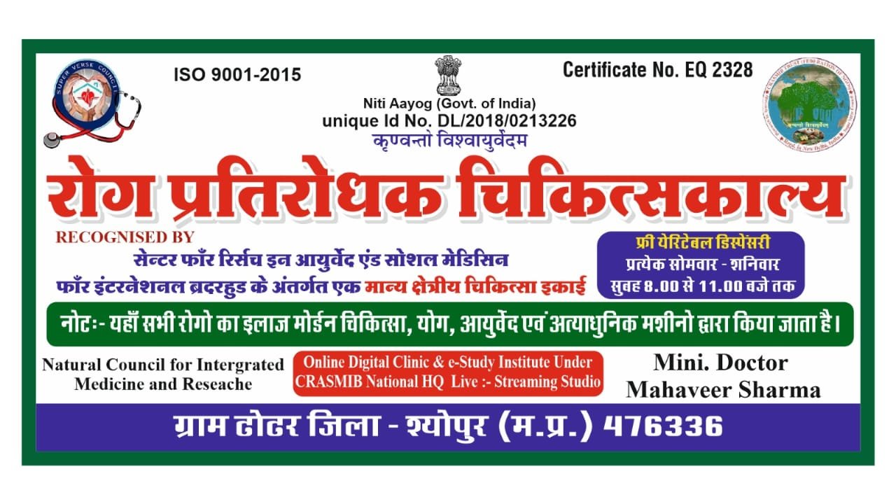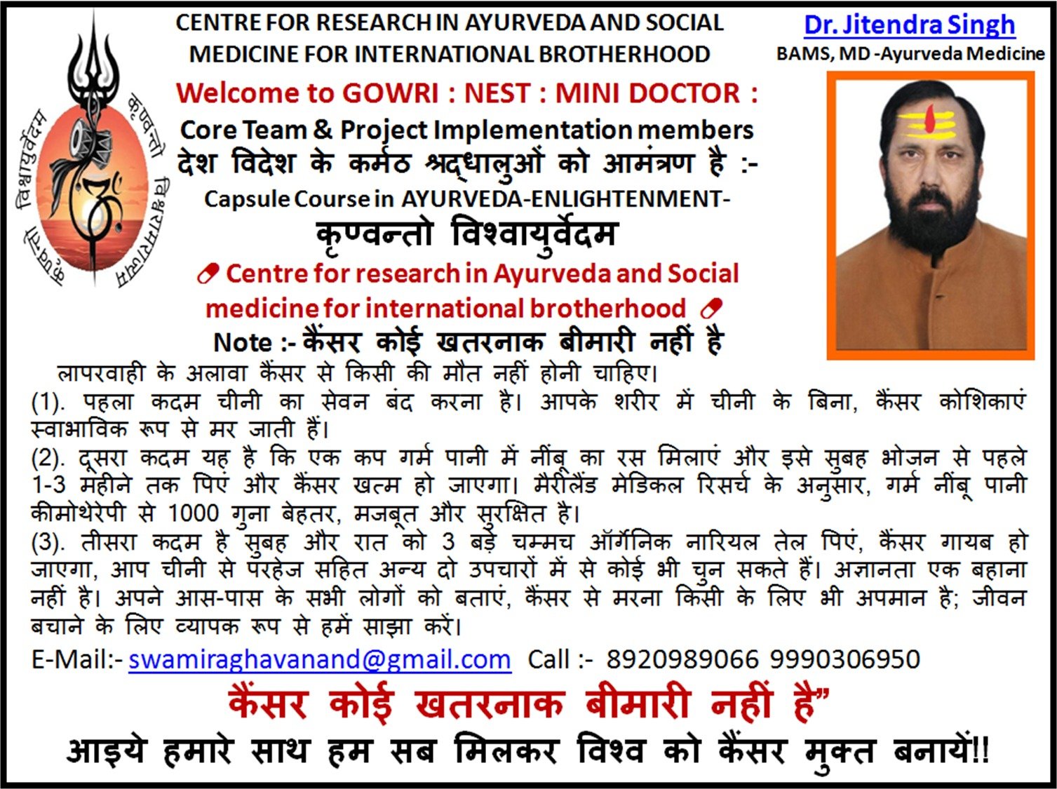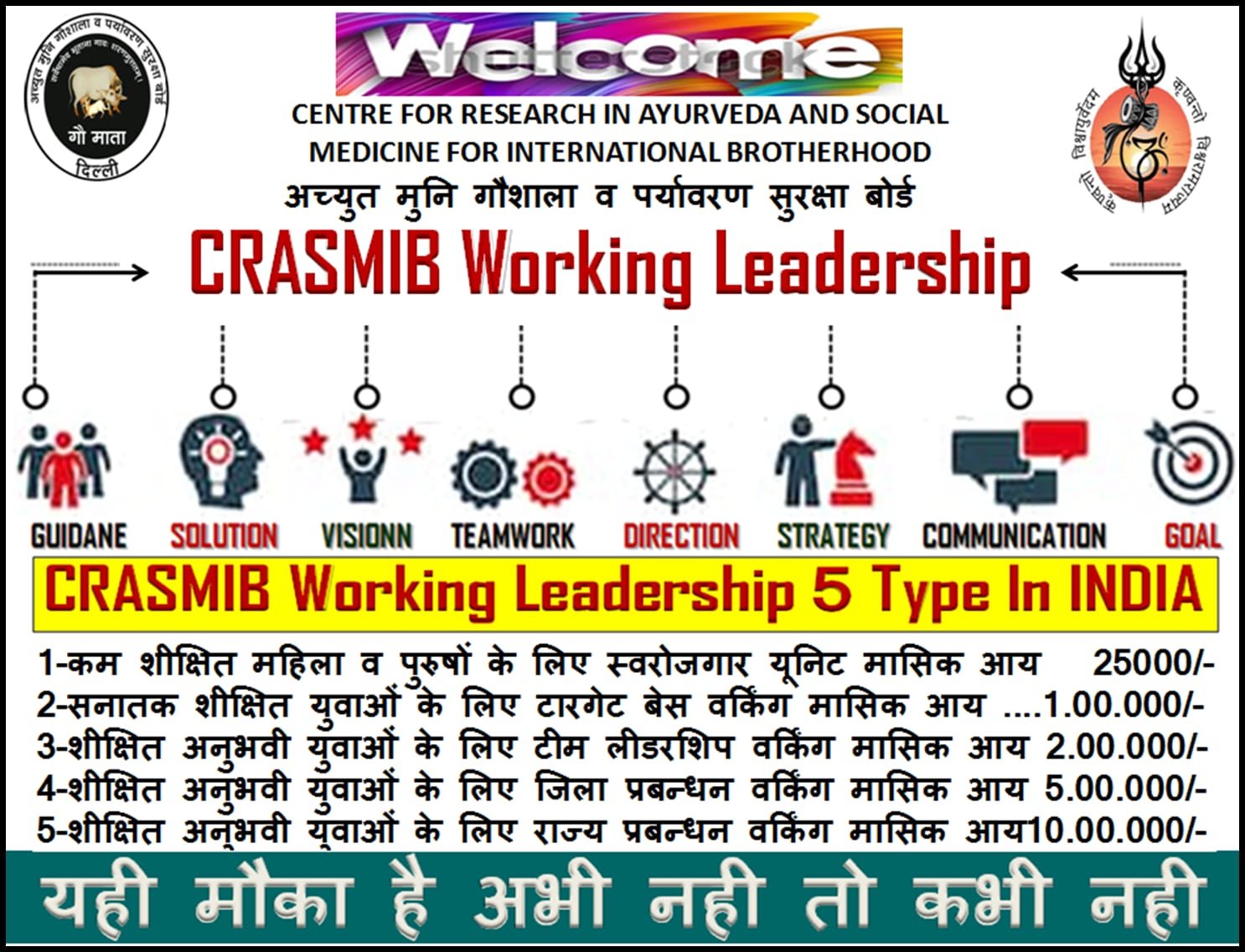 CRASMIB की कृण्वन्तो विश्वायुर्वेदम आयुर्वेदीय परियोजना के तहत स्वस्थ जीवन की मंगलमय मनोकामना के साथ अपने परिवार जनों को निरामय-सुखायु जीवन जीने के लिए आयुर्वेद स्वस्थवृत प्रशिक्षण से जुड़ी हुई कुछ व्यवस्थाओं व चिकित्सा को मनुष्य जीवन की समस्याओं-कठिनाइयों के निराकरण को लेकर के चिंतन-मनन के बाद जटिलतम (Improbable) समस्याओं का समाधान लेकर आप लोगों को अपने प्रोग्राम्स और सतर्कता अभियान के तहत क्रमशः आप लोगों के बीच अपने विचार और औषधि को प्रेषित करने की आज्ञा और अनुमति चाहता हूं । नवाचरण मार्ग द्वारा आज की समस्या बढ़ती बेरोजगारी और बीमारी, दोनों को अपने बीच से MINI DOCTOR प्रशिक्षण कार्यक्रम में निकालने के लिए आयुर्वेद स्वस्थवृत अपनाने के लिए प्रेरित करना चाहता हूं । गैस, एसिडिटी, मोटापा, थायराइड, शुगर, बीपी, कैंसर, जैसे असाध्य रोगों को आयुर्वेद से बड़ी आसानी से खत्म किया जा सकता है । ऐसे में हमारे इंटरनेशनल मार्केटिंग कारपोरेशन द्वारा हमारे बीच कुछ यूनिक प्रोडक्ट हमें CRASMIB अनुसंधान संस्थान के अमृत रूपी घट में निकले है ।