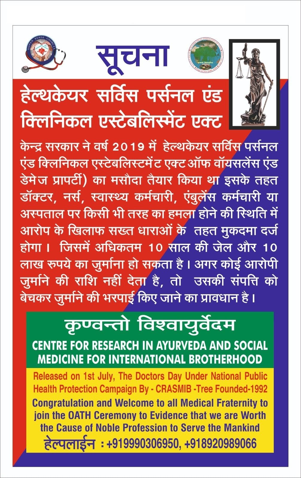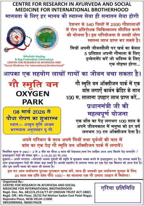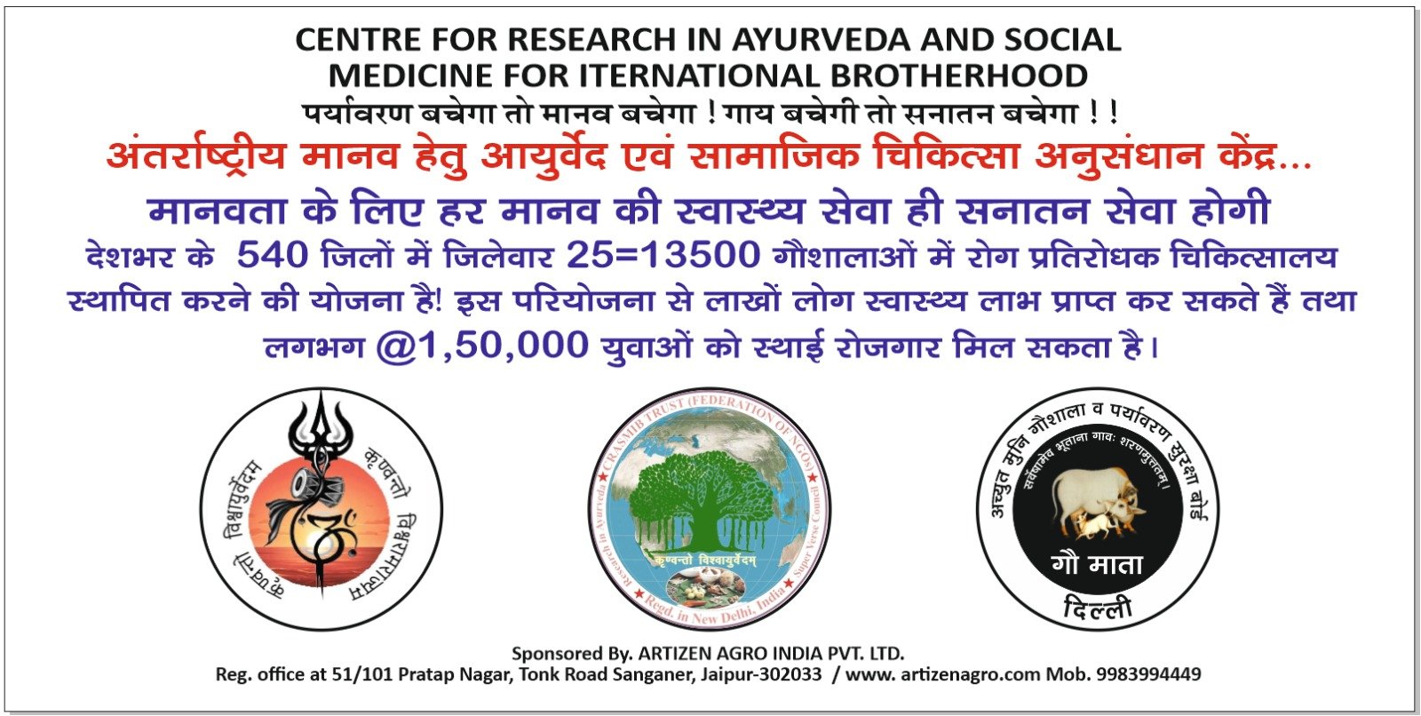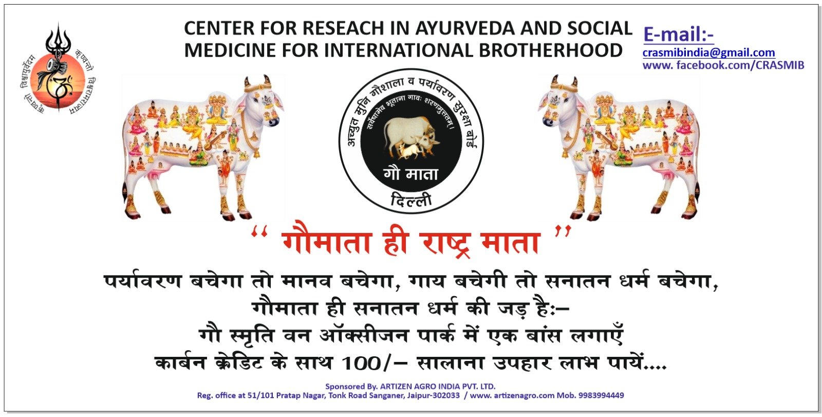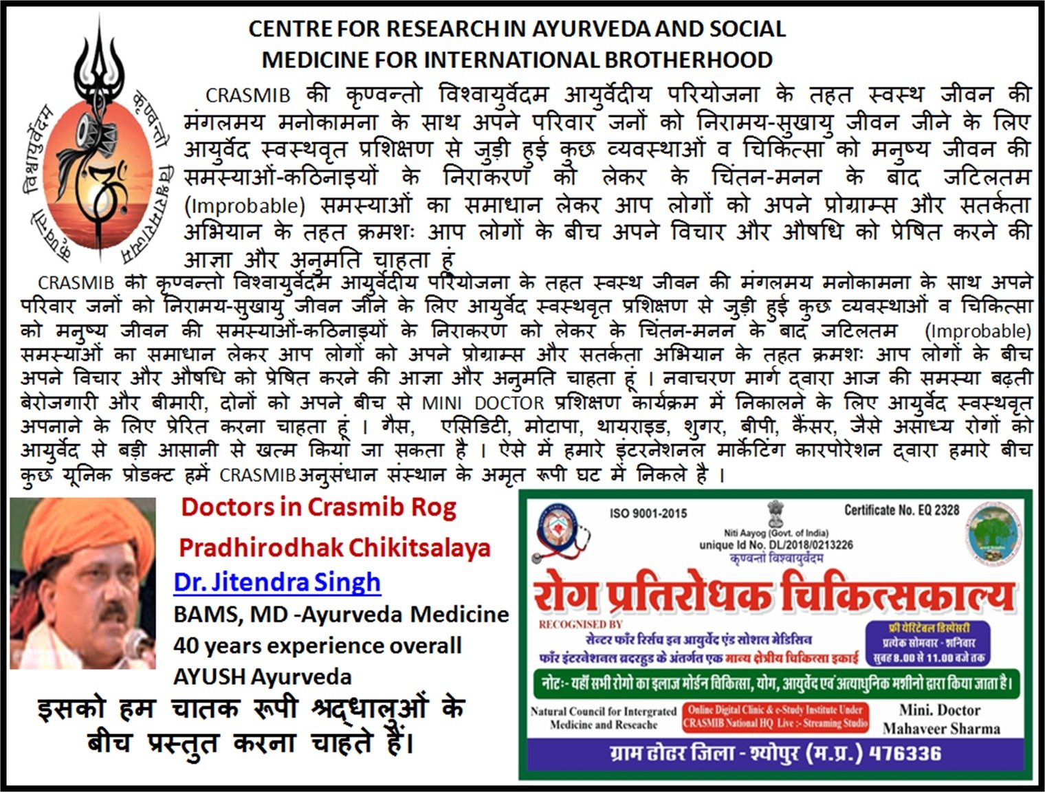 CRASMIB की कृण्वन्तो विश्वायुर्वेदम आयुर्वेदीय परियोजना के तहत स्वस्थ जीवन की मंगलमय मनोकामना के साथ अपने परिवार जनों को निरामय-सुखायु जीवन जीने के लिए आयुर्वेद स्वस्थवृत प्रशिक्षण से जुड़ी हुई कुछ व्यवस्थाओं व चिकित्सा को मनुष्य जीवन की समस्याओं-कठिनाइयों के निराकरण को लेकर के चिंतन-मनन के बाद जटिलतम (Improbable) समस्याओं का समाधान लेकर आप लोगों को अपने प्रोग्राम्स और सतर्कता अभियान के तहत क्रमशः आप लोगों के बीच अपने विचार और औषधि को प्रेषित करने की आज्ञा और अनुमति चाहता हूं !