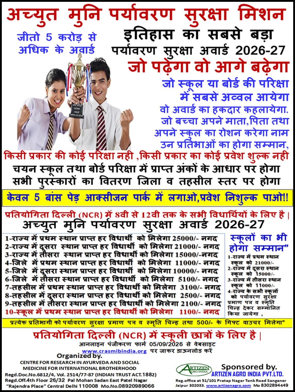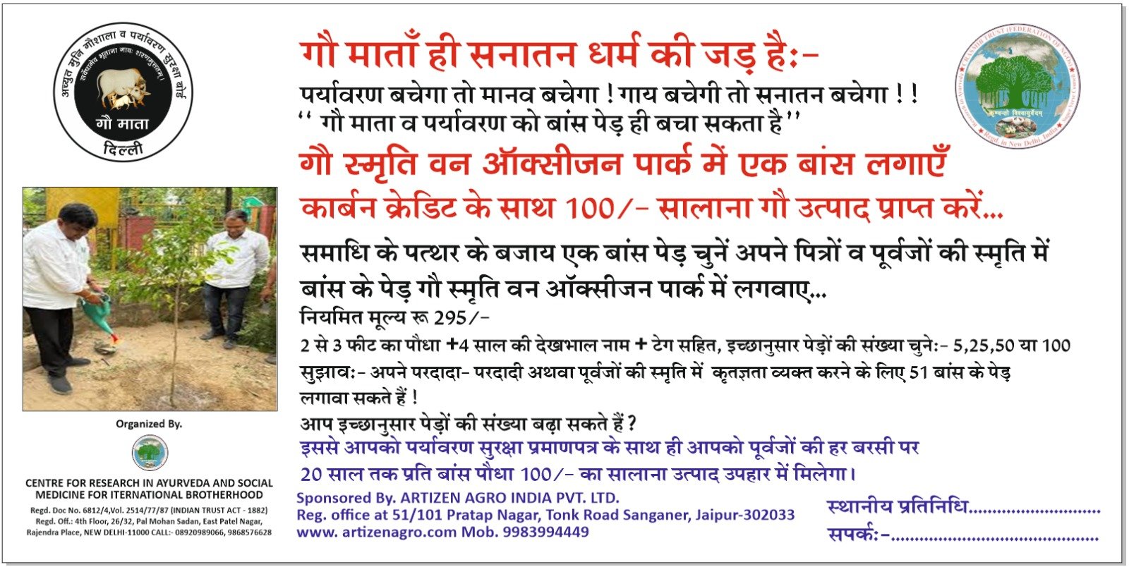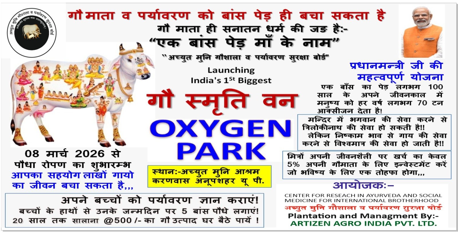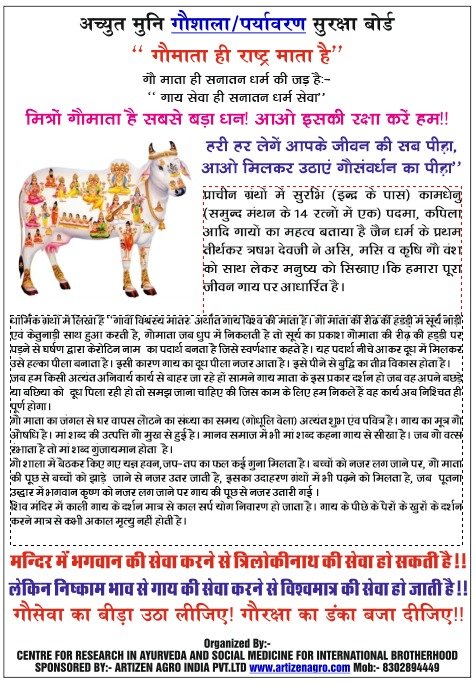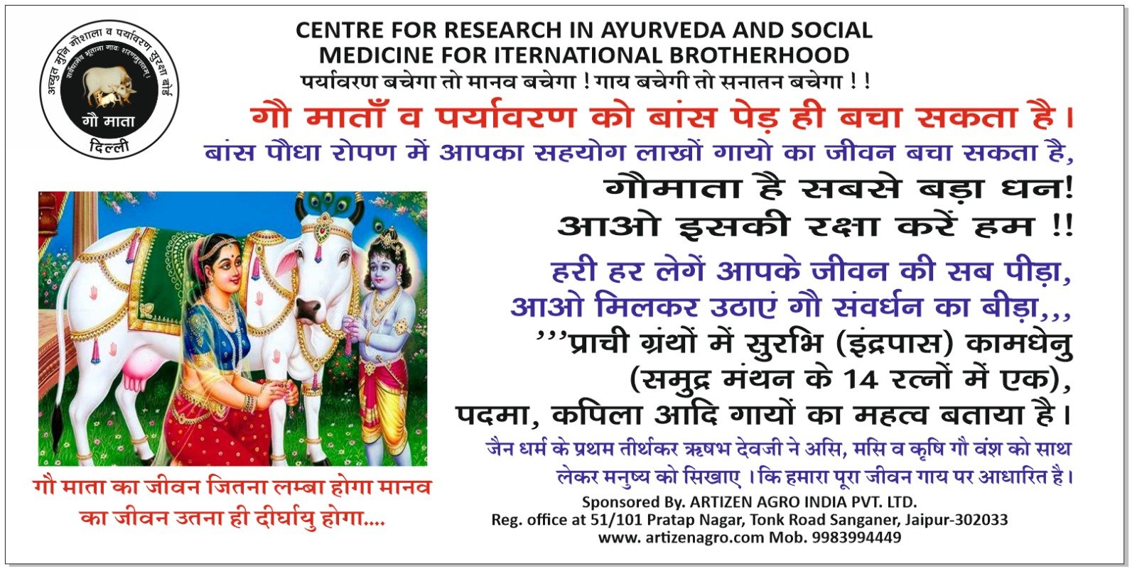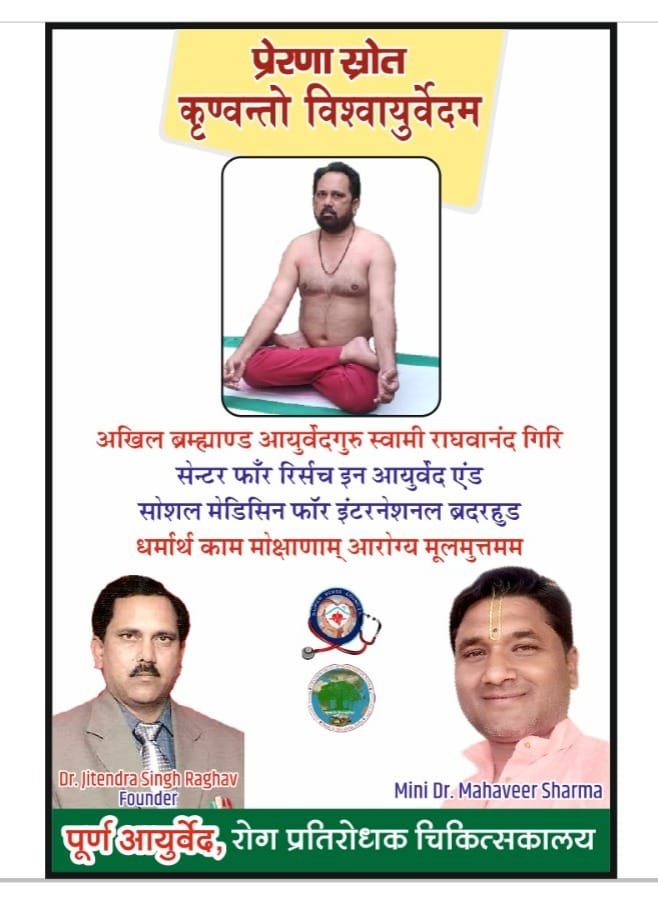 CRASMIB की कृण्वन्तो विश्वायुर्वेदम आयुर्वेदीय परियोजना के तहत स्वस्थ जीवन की मंगलमय मनोकामना के साथ अपने परिवार जनों को निरामय-सुखायु जीवन जीने के लिए आयुर्वेद स्वस्थवृत प्रशिक्षण से जुड़ी हुई कुछ व्यवस्थाओं व चिकित्सा को मनुष्य जीवन की समस्याओं-कठिनाइयों के निराकरण को लेकर के चिंतन-मनन के बाद जटिलतम (Improbable) समस्याओं का समाधान लेकर आप लोगों को अपने प्रोग्राम्स और सतर्कता अभियान के तहत क्रमशः आप लोगों के बीच अपने विचार और औषधि को प्रेषित करने की आज्ञा और अनुमति चाहता हूं !